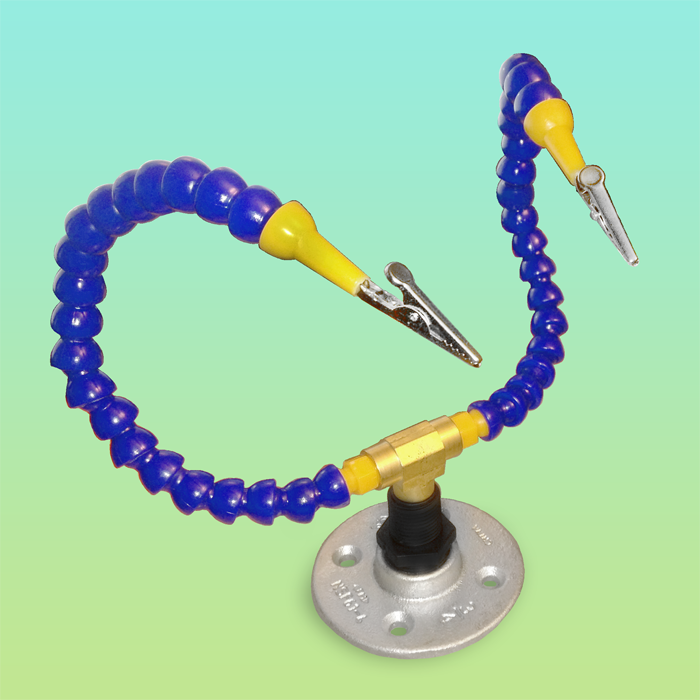 If you’ve ever used these things, you know how evil they are: So I was browsing sparkfun.com and found that they had a new style of helping hands, that seemed… much helpier. In case you didn’t check the link, they looked like this: Well I decided I wanted some – but they were kinda on the pricey side: $35 bills. Luckily they sold the main component separately for a reasonable price. Apparently someone named Ryan Straugh first came up with the idea, as SparkFun points you to his instructable. Cool that he gets some of the proceeds from the sales. Maybe that’s why they’re marked up. Oh well, sorry Ryan. His design looked like this: Both Ryans and Sparkfuns used the idea of an aluminum base with 2 or 3 machine coolant hoses mounted on the top. While I’m sure that works well, I don’t think I’ll be needing to move the hands by 3 inches very often, so I decided to make my mine with a traditional base. Further, the instructable requires a tap & die kit for making threaded holes. I don’t know about all that. Instead of following the instructable, I ordered the hoses from SparkFun and set out to the hardware store to find some off-the-shelf components to make my remix. Below is a shot of what I came up with: Notice how mine has a more traditional base. Now, I could have popped off some of the blue segments, but I left them full length. Since they come out from the base horizontally the extra length give’s them a bit of room to curve upward. I used a 1-inch pipe flange for the bottom, a 1″ to 1/2″ PVC pipe adapter, and some brass fittings. I’m not sure how pipes are measured, because the package labels are slightly smaller but I guess pipes aren’t measured from the outside diameter. Over all, I saved a few bucks and made one that I humbly think looks way more bad ass. Check the video below for the build. Here’s a few more pictures! August 20, 2014 at 8:27 am | Other Projects, Video |