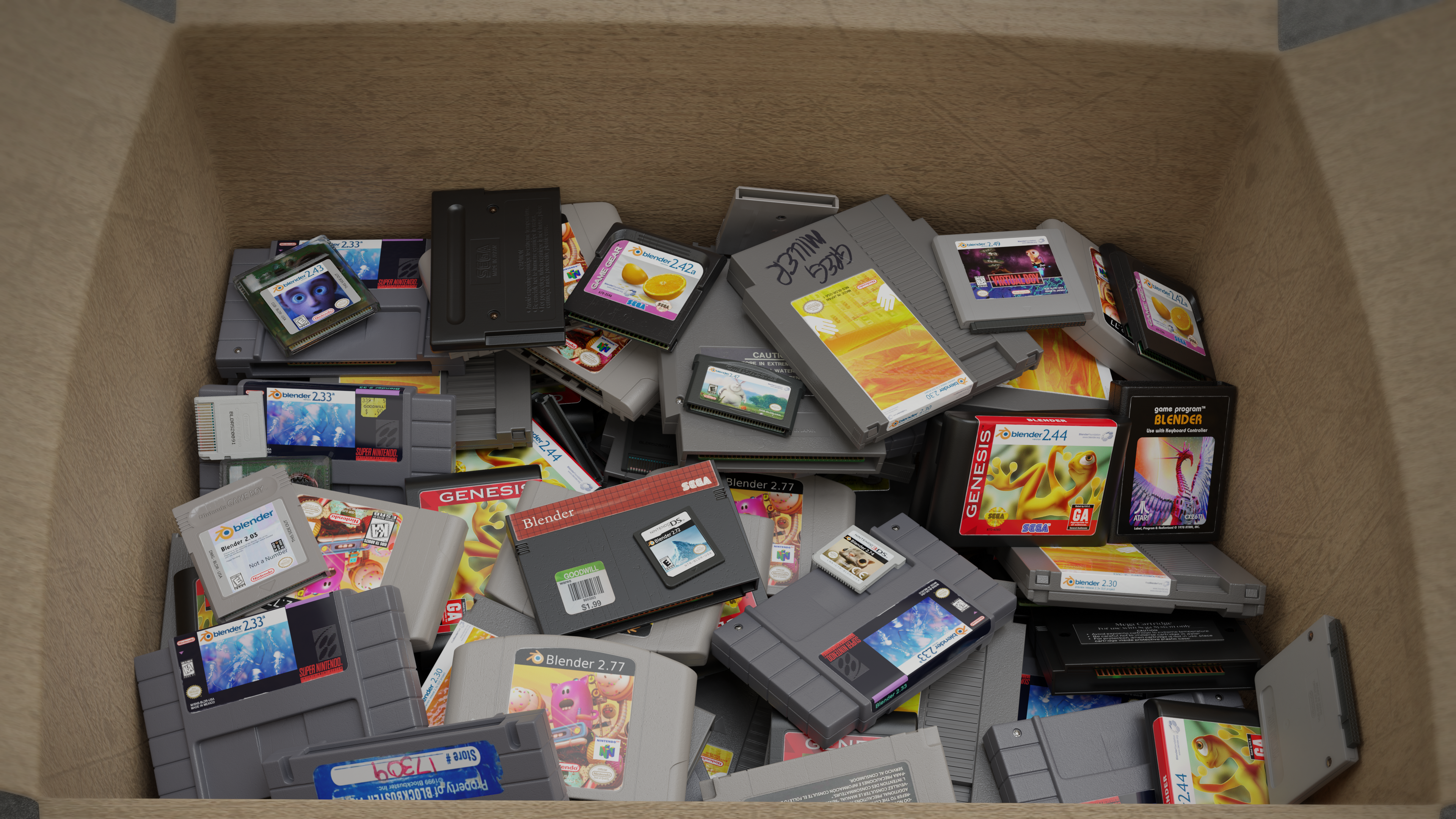 After I had all the models ready, I decided to use a Physics simulation in Blender to fill a cardboard box with the retro cartridges. For fun, I decided to use the historical Blender splash screens for the cartridge labels. Imagine if Blender was available on all these platforms!