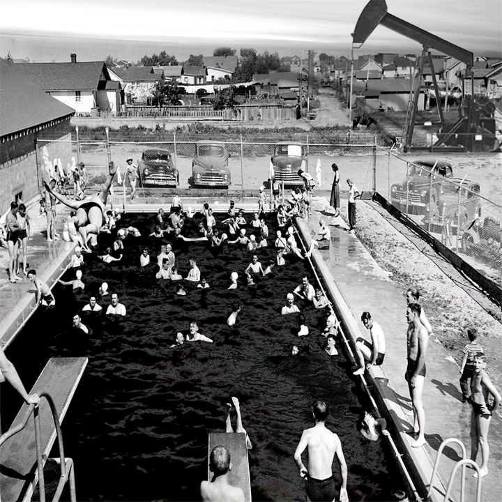 After WWII and into the 1950's our economy was booming and suburban sprawl covered the nation. We had discovered Texas oil and the whole world had a seemingly unlimited supply of oil. We were swimming in oil and looking for new ways and technologies to apply it. As years passed and science improved, we be came very adept at making oil based products, from plastics to pesticides, let alone raw automobile fuel. However, we've now reached peak oil, and the world has a global economy closer to Globalization than ever before in history. But our entire economy is based around oil and it's running thin. Our bubble is about to burst. Because we have no viable solutions for the replacement of oil, the future will be drastically different. No more Walmart's importing cheap-labored goods from across the planet. No trucking routs or rush hour traffic. No more big business. No groceries stores with packaged products. Our most notable change will be the localization of agriculture and reclaiming suburban land. These pictures represent our past, present and future relationship with oil.
