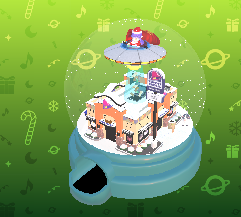 A year went by, and I decided to revisit the project yet again. All the code was there, so really I just needed a new Snow Globe and some new community wishes. I got the ball rolling. Reli often talks about her love for Taco Bell, so this time I thought it would be fun to model a mini Taco Bell snow globe.