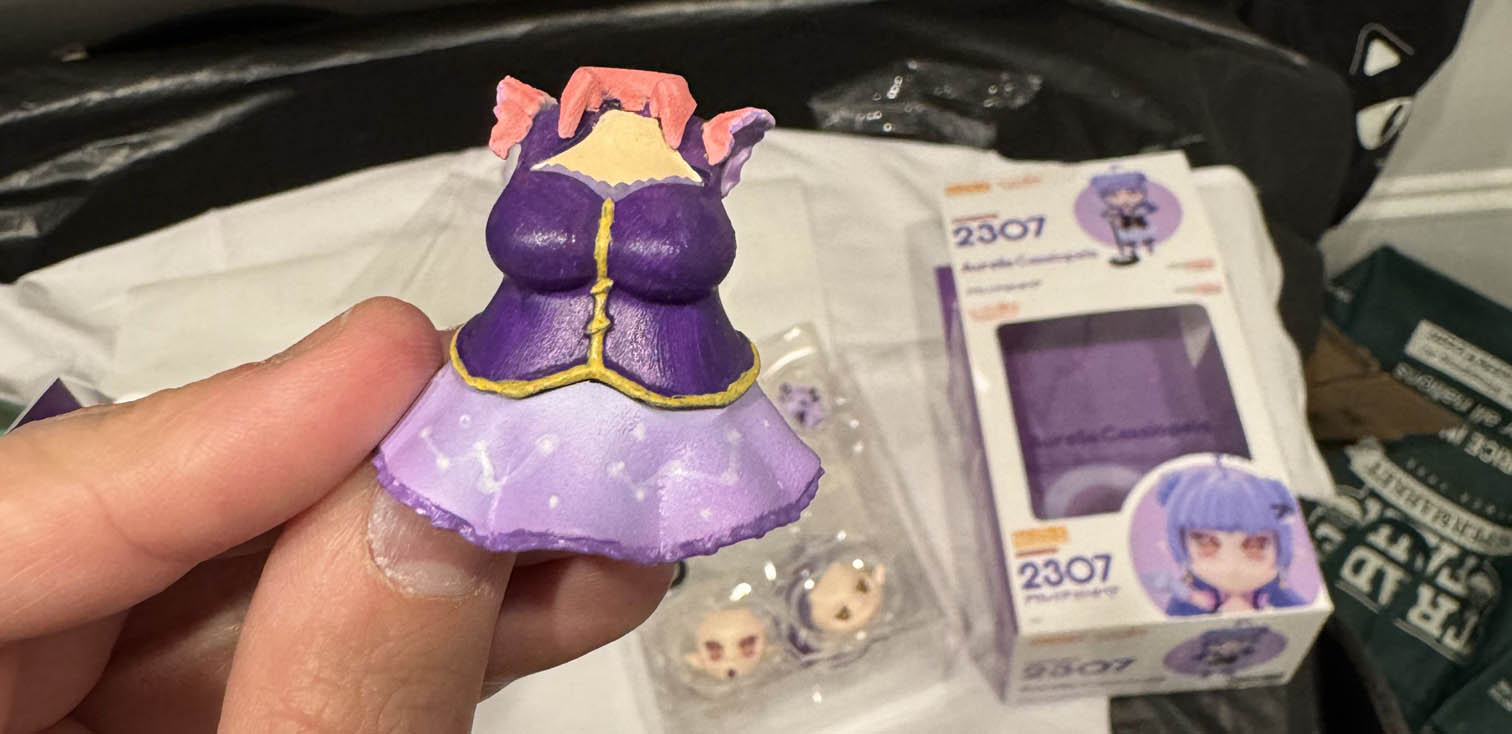 In the Anime and vTuber scene, many popular characters have Nendoroids made out their character. Nendoroids are kinda like Funkopops in the way that they're hyper collectable. Except they're cute, customizable, posable, and way better quality - so basically nothing like Funkos. Over the years I've bought a handful of the official Hololive Nendoroids, for characters such as Oozora Subaru, Haachama, Inugami Korone, etc. When I started watching Aurelia Cassiopeia, a small indie vTuber, I decided it would be a fun project to try to create a 1:1 recreation of a Nendoroid for her character, box and everything.