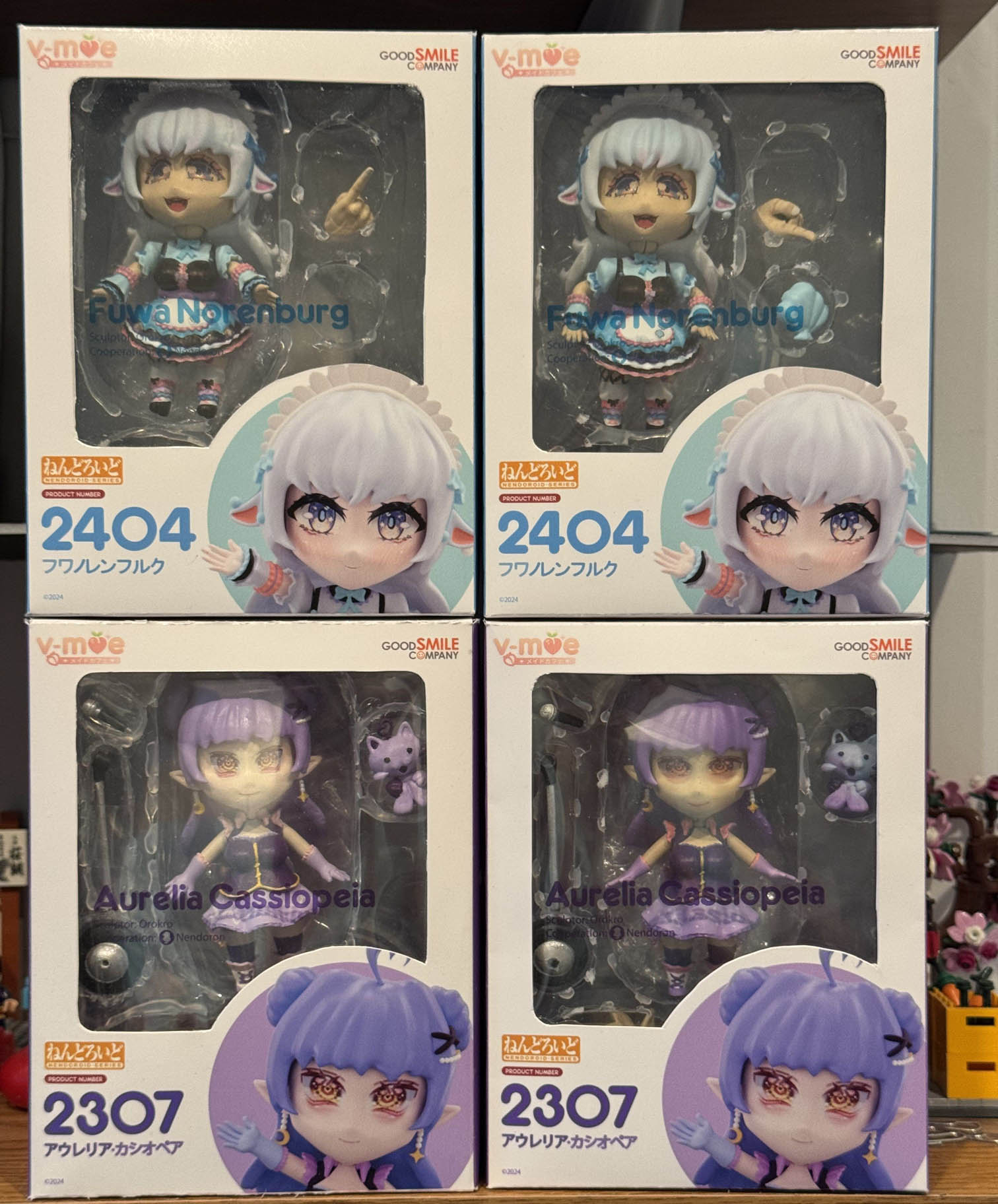 Later that year I had the opportunity to go to Offkai, which is a vTuber convention hosted in San Jose California. Of the many vTubers attending, Aurelia Cassiopeia was there so I decided to make another Nendoroid to gift her, as well as another completely different character, which I'll take about in another post. Here's the complete in box set of four I've built: