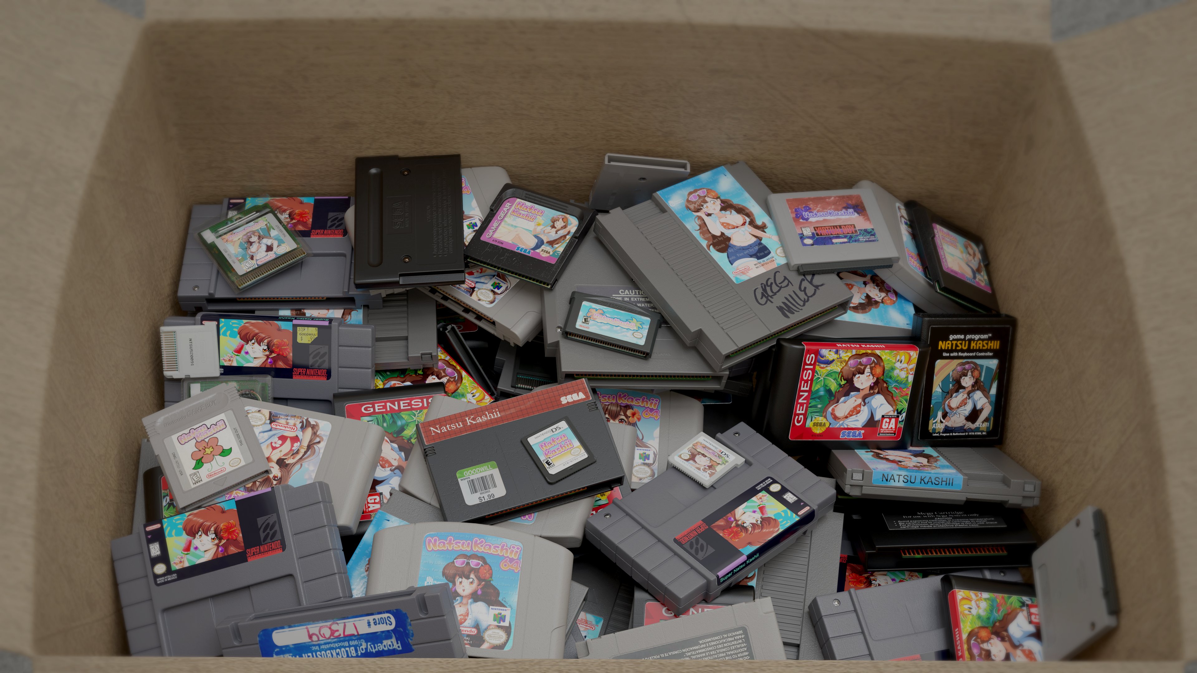 Later, when the retro-only vTuber Natsu Kashii debuted, I decided to dust off the render and swap out all the labels with fan art for her, as if she had all these games made!