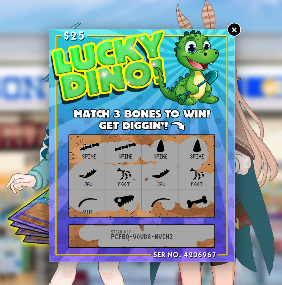 When I went searching for a way to buy the Shashingo Steam key, I was only able to find it as part of a Humble Bundle. That meant, there would be about 9 keys for the price of one. I decided to give away all 9 keys as part of the experience. The game play loop is to click the scratchers, see if there's a winner, and if there is the steam key will be valid. If not, it will be a randomly generated steam key. I programmed in some probability so not every ticket will be a winner and there will be some random about of losers in between.